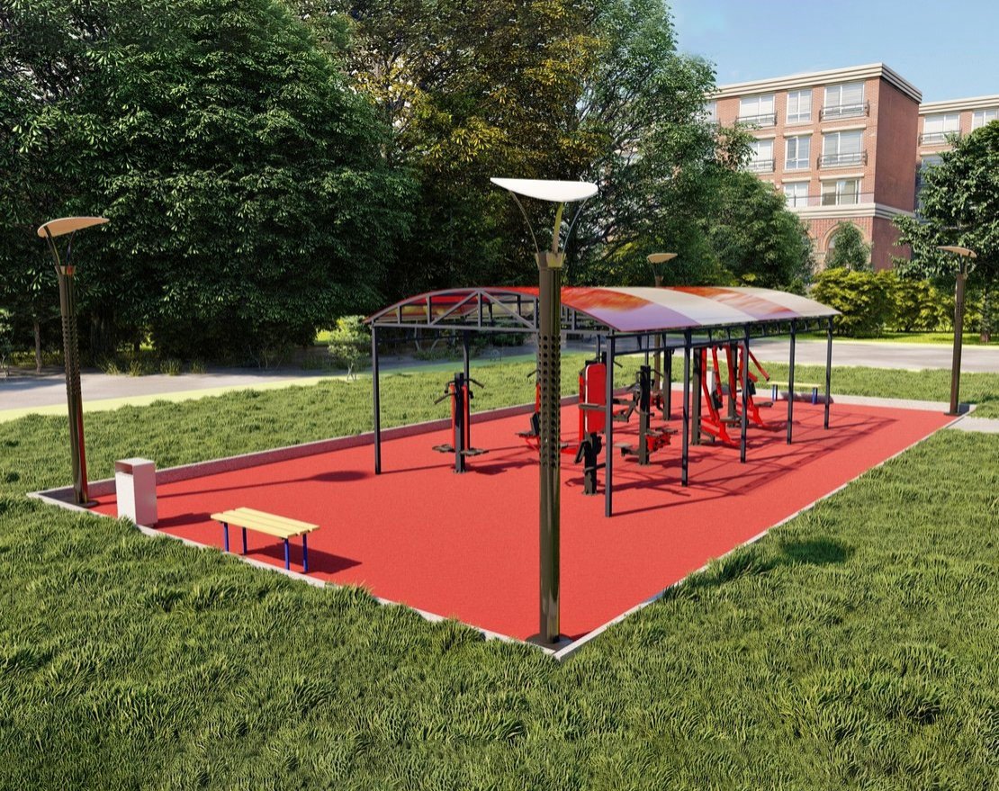 - Теневой навес «Спорт МФ 752,02» на восемь тренажёров: длина— 8,22 м, ширина— 4,36 м, высота—2,81 м. Зона безопасности: 7,36 х11,22 метра.