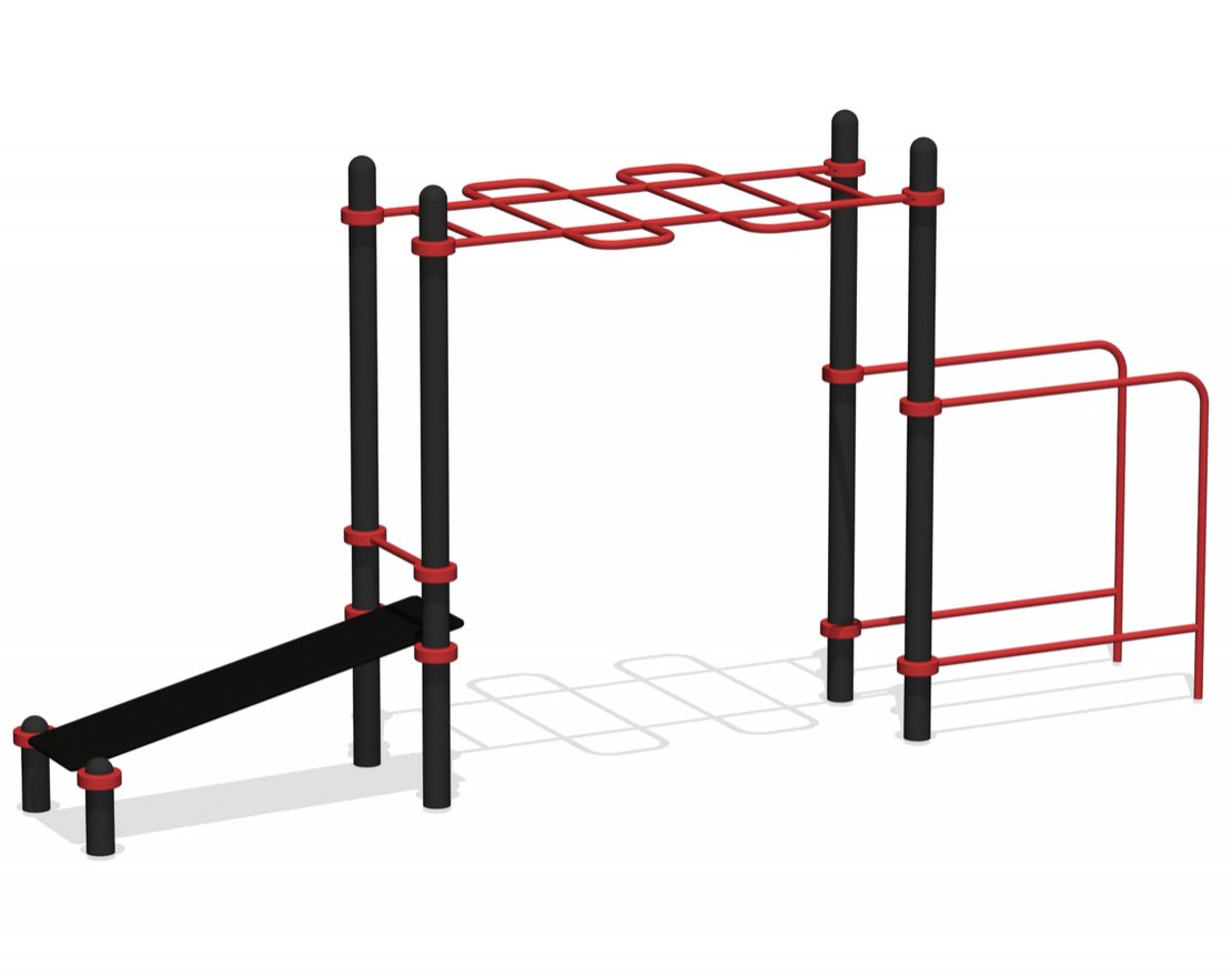 • В комплект входит: брусья, рукоход, скамья для пресса