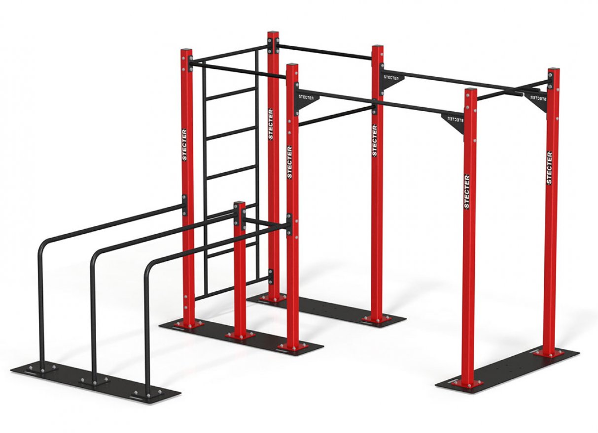 Спортивный комплекс представляет собой сборную конструкцию из металлических элементов. Он состоит из опорных столбов, перекладин, брусьев, шведской стенки и перекладины для узкого хвата. Комплекс легко монтируется и демонтируется благодаря болтовым соединениям.