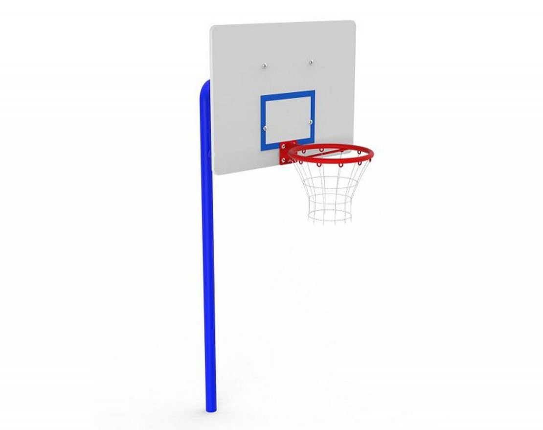 Щит изготовлен из влагостойкой фанеры ФСФ, кромки которой отшлифованы и закруглены для безопасности детей. Баскетбольное металлическое кольцо имеет диаметр 21 миллиметр. Опорная стойка выполнена из круглой металлической трубы. Все металлические элементы изделия покрыты антикоррозийным оцинкованным покрытием.