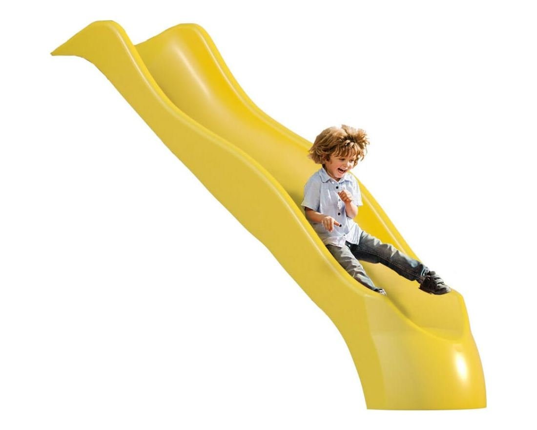Углубленный спуск с высокими бортами позволяет кататься с горки безопасно даже для малышей. Длина горки — 2650 мм, ширина — 580 мм, высота — 1500 мм. Материал — ПНД, цвет желтый.