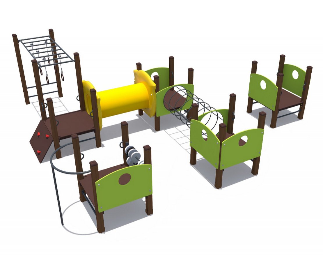 • В комплект входит: гимнастические кольца, рукоход, скалодром, счеты, кольцевой лаз, туннель