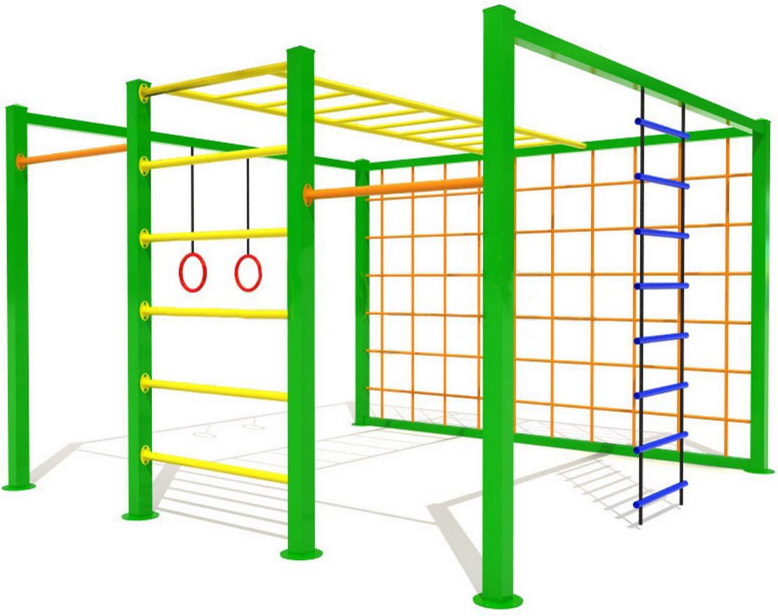 Комплекс оснащён разнообразными элементами: лесенки, турники, рукоходы, стенка-клеточка и гимнастические кольца.
