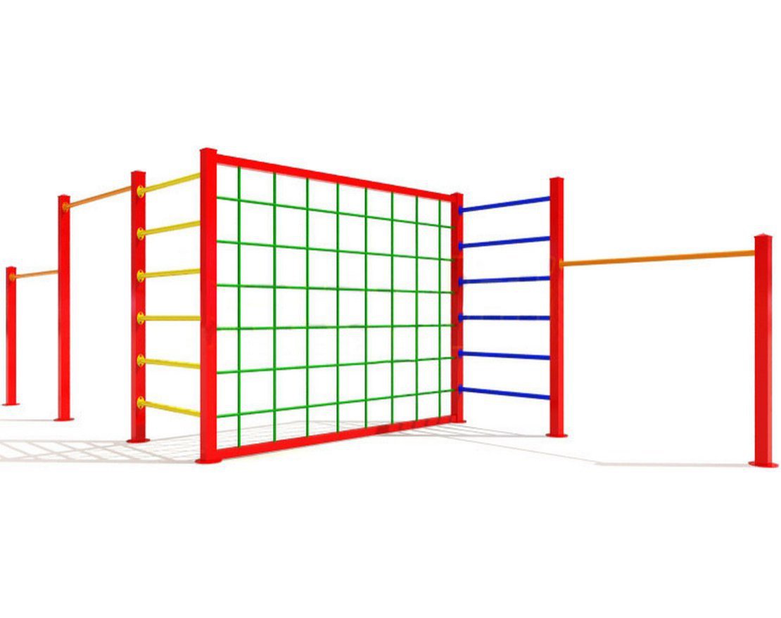 2. Разнообразие элементов. Площадка включает разнообразные элементы для разных возрастов и уровней физической подготовки: лесенки, шведские стенки, стены-клетки и другие.
