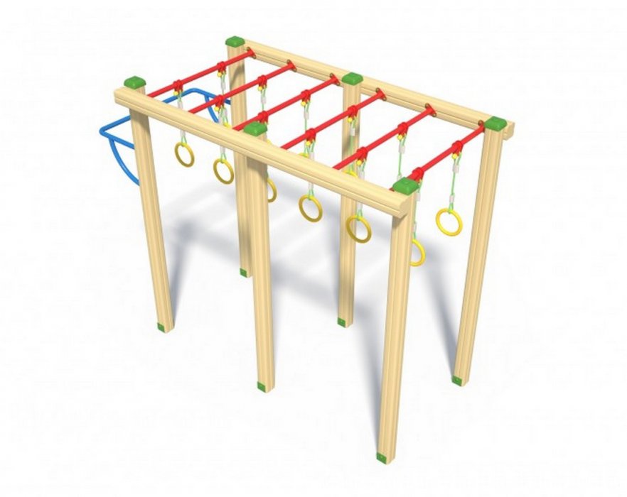 Несущие столбы комплекса должны быть выполнены из клееного бруса сечением 90х90 мм. Сверху столб должен заканчиваться пластиковой заглушкой, снизу столб должен заканчиваться металлическим подпятником сечением Ø 42 мм, который бетонируется в землю.