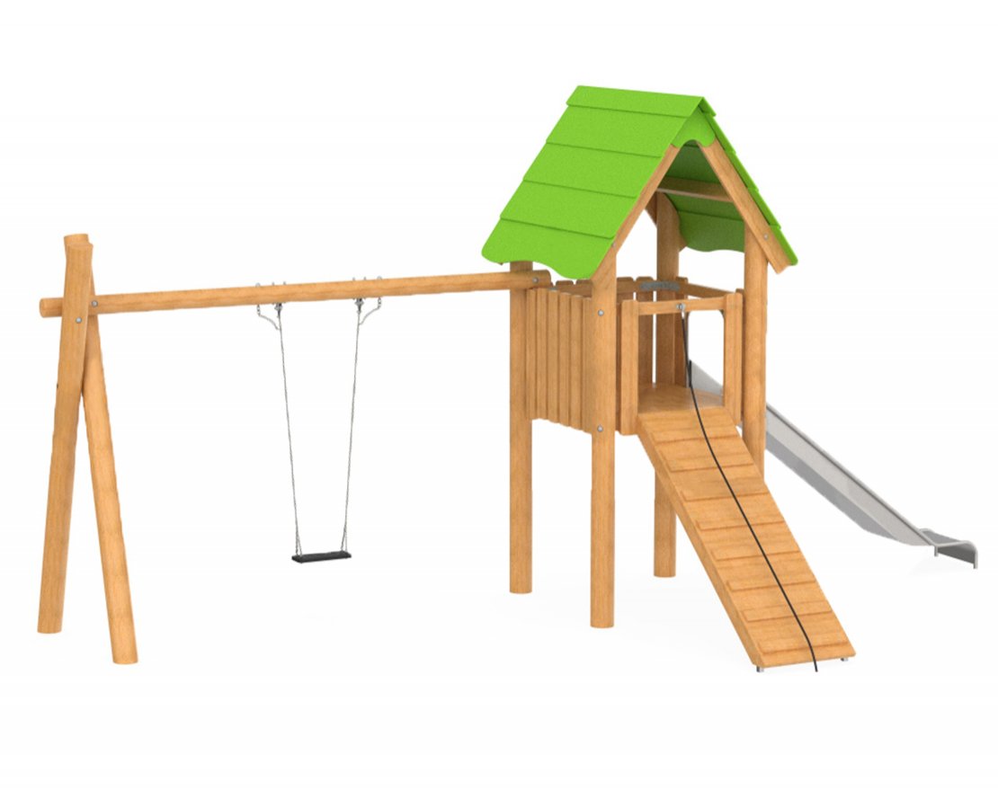 Игровой комплекс «Хижина» с качелями, тип 1, версия 895.04, исполнение 1 — это сборно-разборная конструкция, предназначенная для установки на детских игровых площадках, в дошкольных учреждениях, школах, парковых зонах, во дворах и других местах активного отдыха.