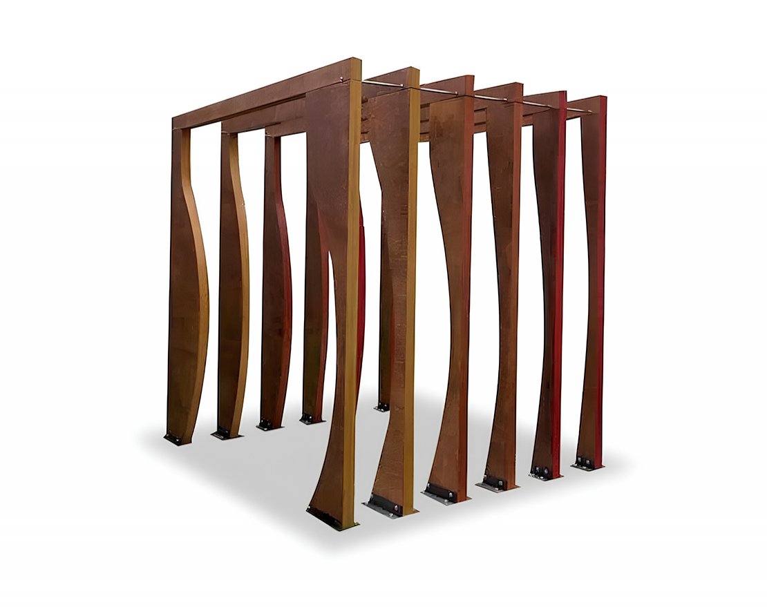 Теневой навес МАФ 2 представляет собой группу из 6 арок. Внешние контуры арок прямолинейные и формируют параллелепипед, а внутренние контуры арок криволинейные, различного профиля, что позволяет создать иллюзию криволинейного туннеля внутри навеса.