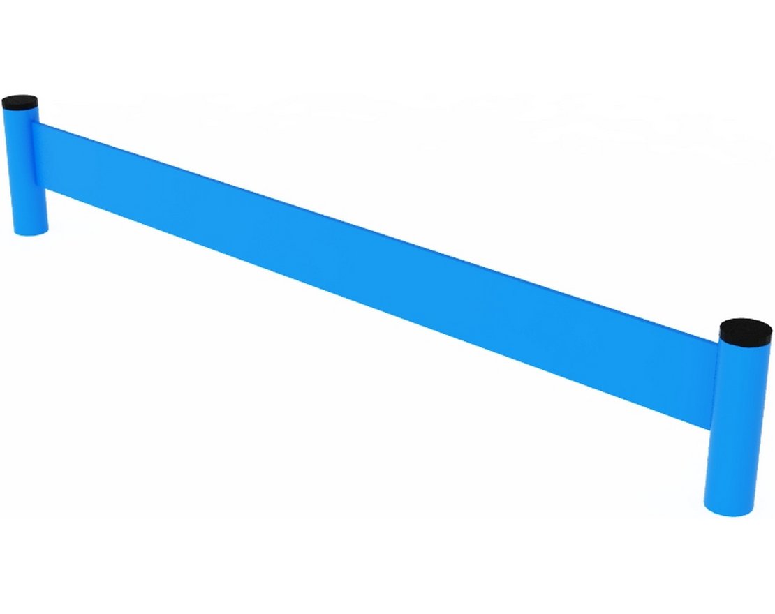 Выполнен из трубы диаметром 27 мм, гнутой в виде буквы П, и стальной полосы 50х5 мм. Металл имеет плавные радиусы, тщательную обработку швов, покрыт порошковой краской в синий цвет.