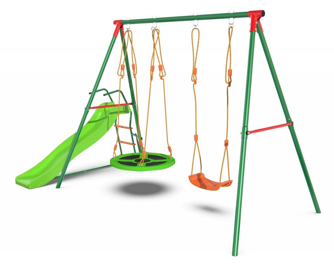 - Разнообразие элементов: комплекс предлагает различные виды качелей, включая веревочные и качели-гнездо, а также горку.