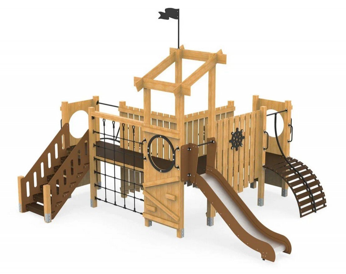 Комплекс представляет собой сборную конструкцию, состоящую из опор, настила, горки и других элементов. Опоры выполнены из бруса хвойных пород, а настил — из фанеры. Скат горки изготовлен из нержавеющей стали. Все металлические детали имеют оцинкованное покрытие, а пластиковые заглушки защищают от попадания влаги.