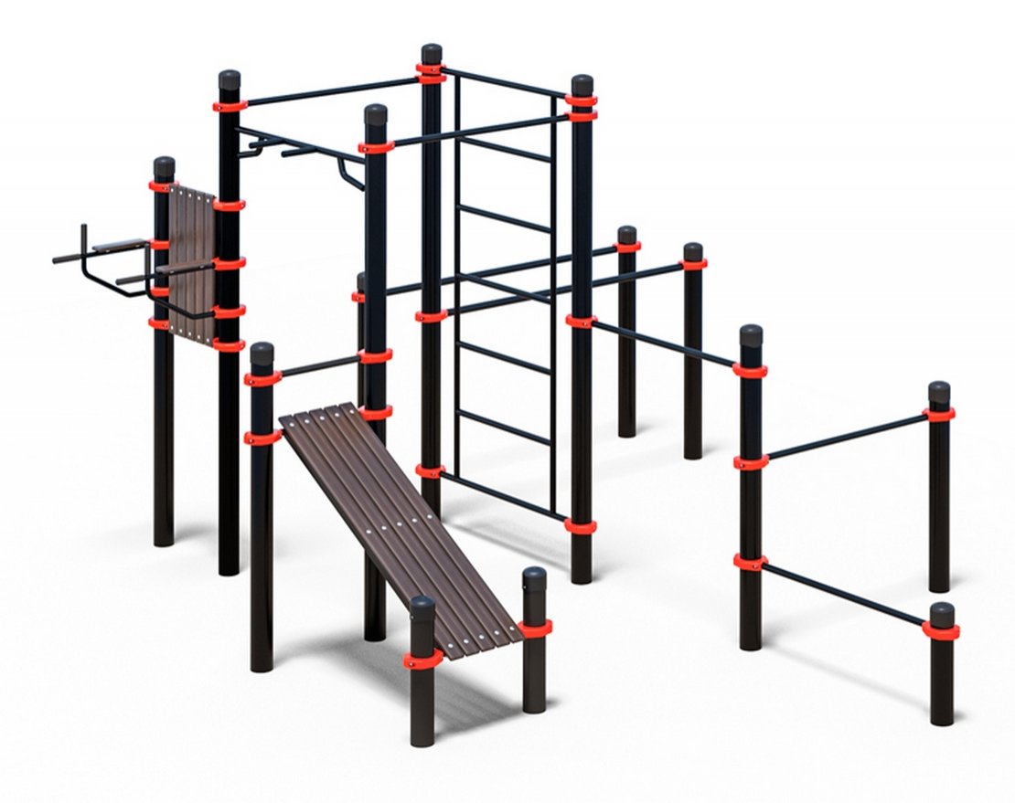 Комплекс «Богатырь» — это набор уличных спортивных снарядов для занятий воркаутом, который включает в себя всё необходимое для разнообразных тренировок. Комплекс состоит из 14 прочных опорных столбов, изготовленных из стальных труб с толстыми стенами. Столбы имеют различную высоту — от 500 до 2 600 миллиметров.
