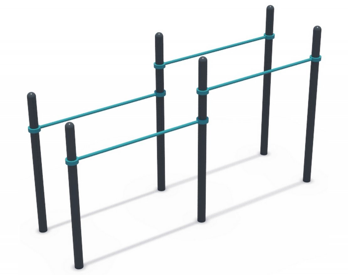 Комплекс состоит из шести опорных столбов и четырёх перекладин, которые выполнены из металлических труб и фиксируются специальными хомутами. Металлические элементы изготовлены из высококачественных материалов и соответствуют стандартам ГОСТ. Все металлические элементы окрашены в заводских условиях порошковыми красками, а весь крепёж оцинкован. Уголки закруглены, что исключает риск получения травм.