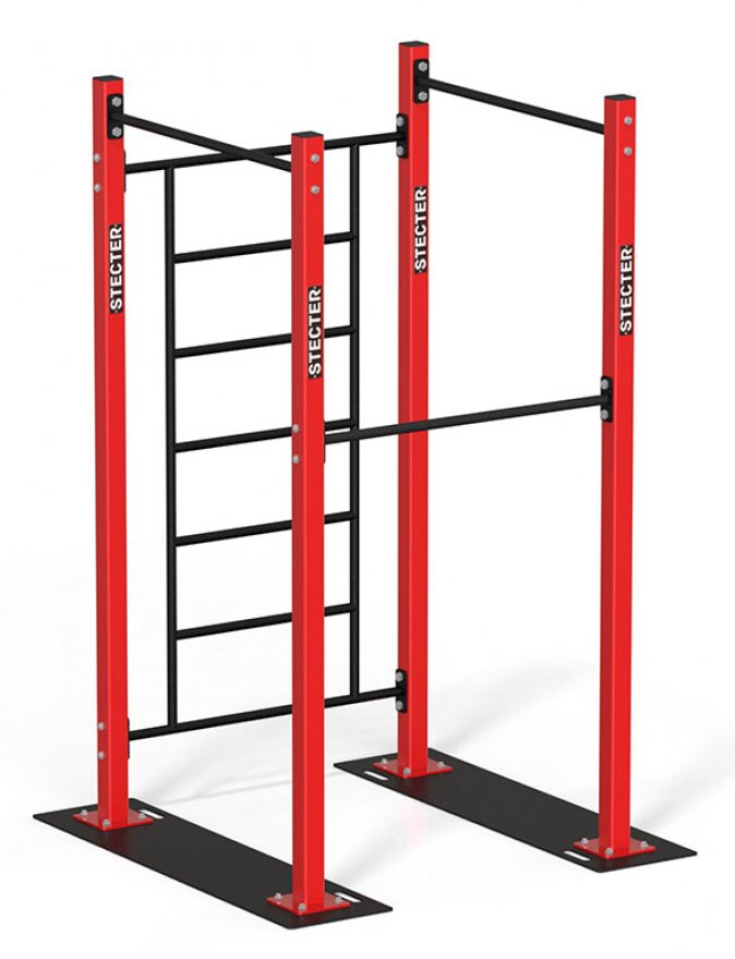 Этот мобильный комплекс предназначен для занятий спортом на открытом воздухе. Он представляет собой сборную конструкцию из металлических элементов. В неё входят четыре опорных столба, три перекладины на разной высоте и шведская стенка. Элементы соединяются с помощью болтов. Комплекс легко устанавливается и демонтируется. Его разборная конструкция обеспечивает высокую прочность.