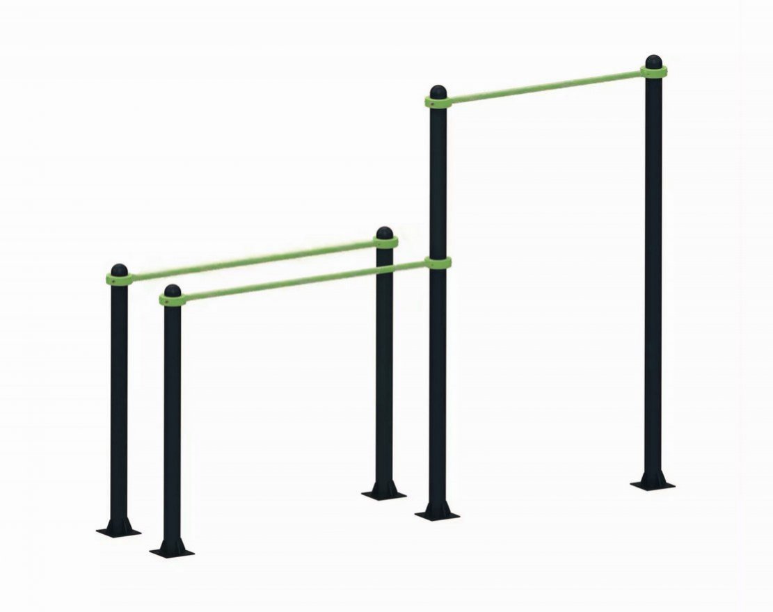 Комплекс изготовлен из прочной стали и покрыт порошковой краской. Цвет покрытия можно выбрать из таблицы RAL, что позволяет вписать комплекс в любой дизайн-проект.