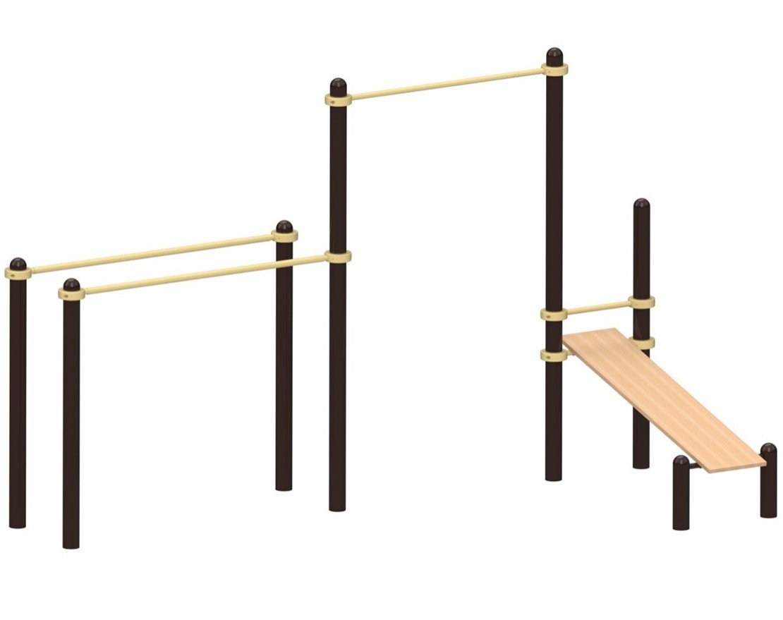 Комплекс включает турник, брусья и скамейку для пресса и может быть установлен на любой ровной площадке. Он подходит для занятий спортом и поддержания физической формы.
