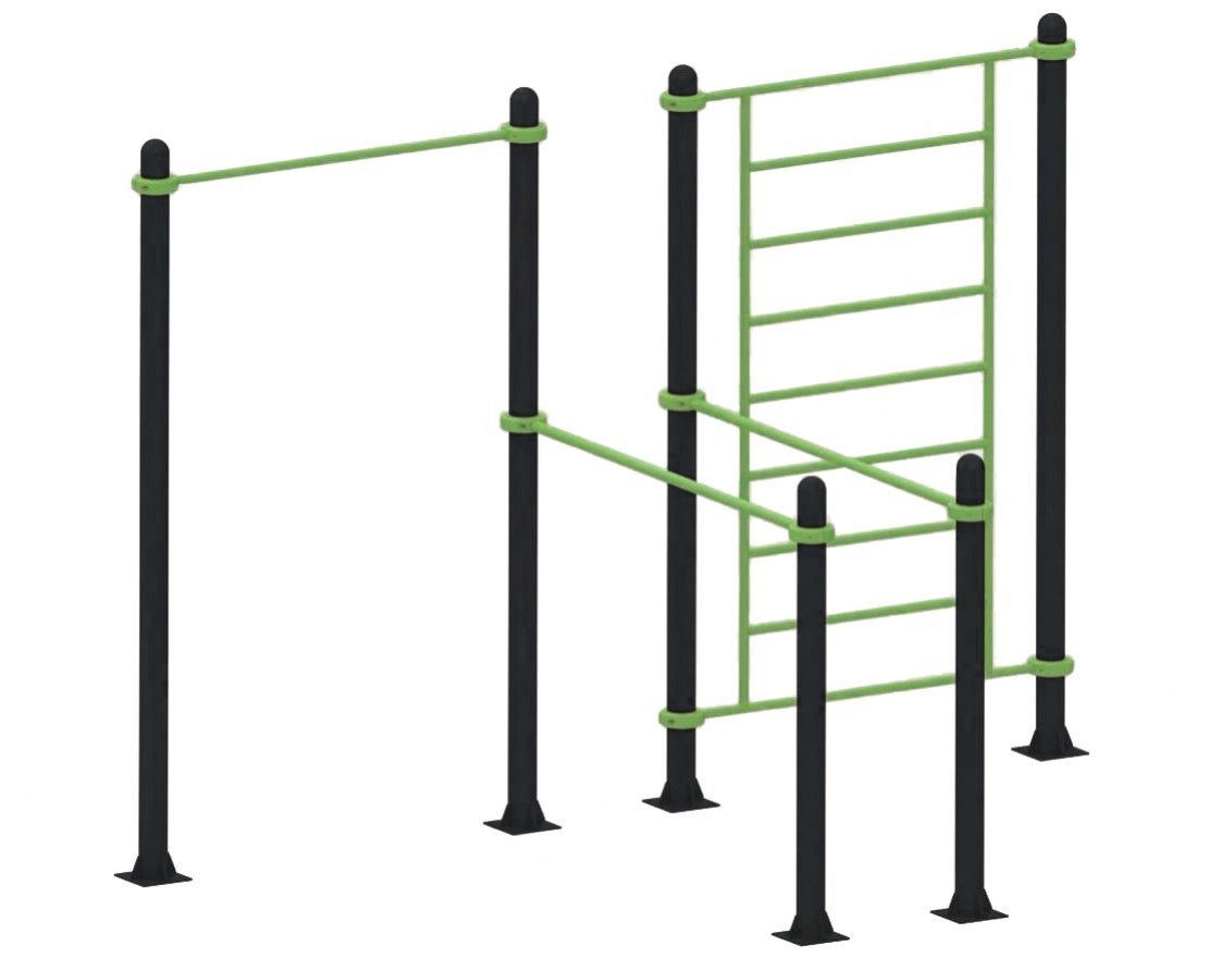Элементы комплекса регулируются по высоте благодаря хомутам, что позволяет адаптировать его под рост пользователей. Также возможно менять расположение комплекса в плане за счёт круглых труб, входящих в конструкцию.