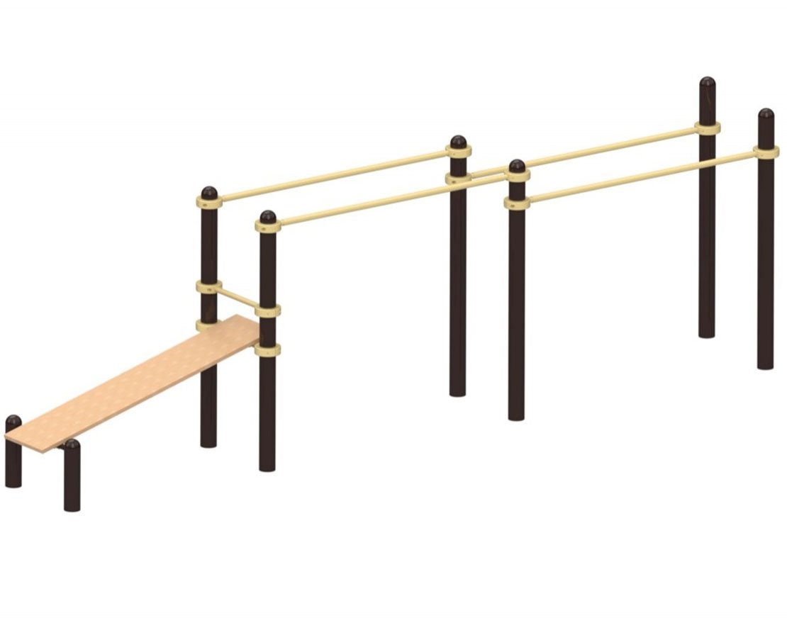 Уличный тренажёр — это функциональный спортивный комплекс, который состоит из нескольких снарядов. Он включает в себя скамью для пресса и две пары брусьев с разной высотой перекладин, что позволяет выполнять разнообразные упражнения для поддержания физической формы и развития силы.