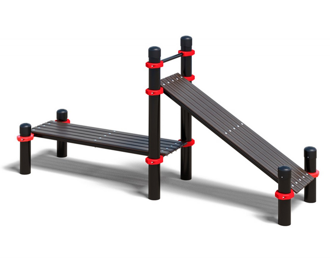 Наши площадки предназначены для установки на улице, поэтому для их изготовления мы используем материалы, устойчивые к воздействию погодных условий. Все металлические элементы покрыты порошковой краской, а опорные столбы имеют пластиковые заглушки, что делает площадку безопасной для использования.