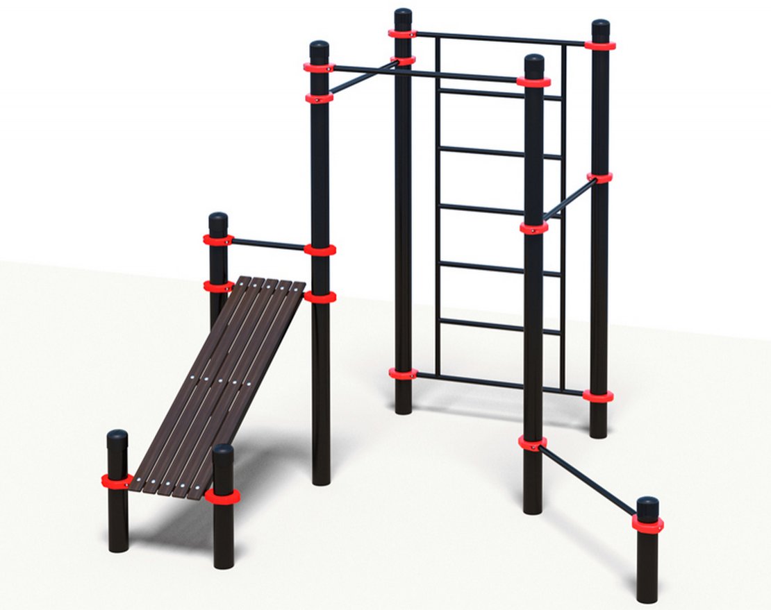 В качестве основы комплекса используются 8 опорных стальных толстостенных столбов длиной от 55 до 2,6 метра. К ним крепятся все аксессуары.