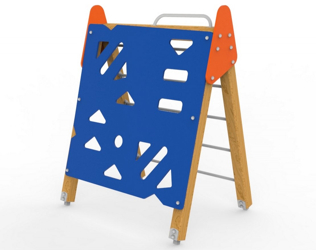Лаз состоит из двух основных элементов: панели для скалолазания, которая изготовлена из влагостойкой фанеры ФСФ с закруглёнными кромками, отшлифованными для безопасности, и лестницы с перекладинами из круглой металлической трубы, устойчивой к износу.