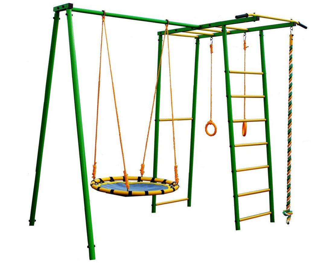В комплектацию входят гимнастические кольца, качели-гнёзда диаметром 80 сантиметров, канат и два турника. Установка комплекса осуществляется с помощью бетонируемых в землю стаканов, на которые «одеваются» стойки конструкции.