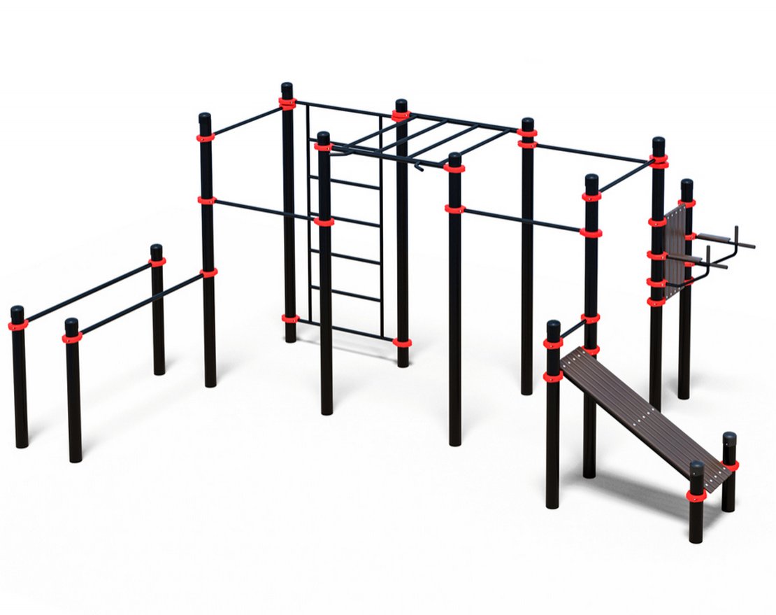 Комплекс из брусьев и разноуровневых спортивных снарядов для занятий на свежем воздухе — это функциональная и универсальная площадка для тренировок на открытом пространстве. В состав комплекса входят: