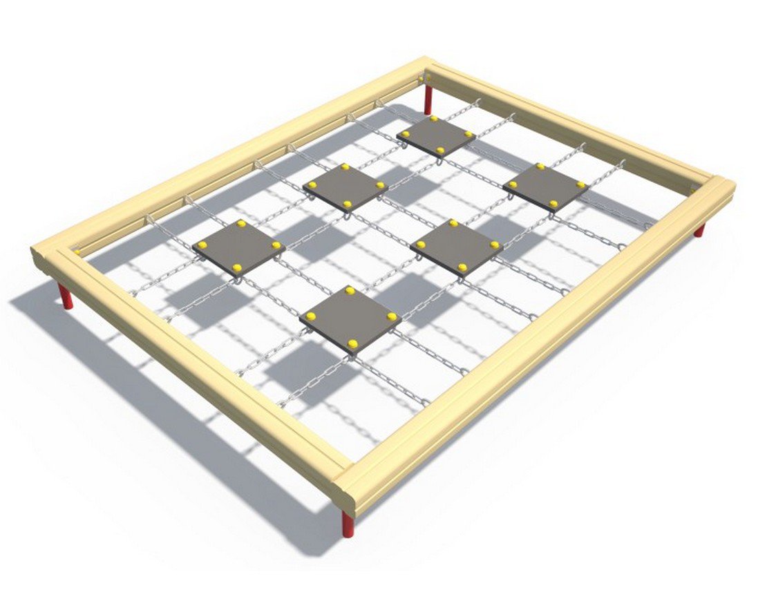 Спортивное оборудование для улицы предназначено для организации безопасной зоны физической активности детей от 6-ти лет. Полоса препятствий состоит из ступеней, подвешенных на металлических цепях к каркасу из бруса, что придаёт конструкции надёжность и устойчивость. Каркас выполнен из клеёного бруса сечением 90×90 мм, а ступени — из ламинированной влагостойкой фанеры толщиной 18мм.