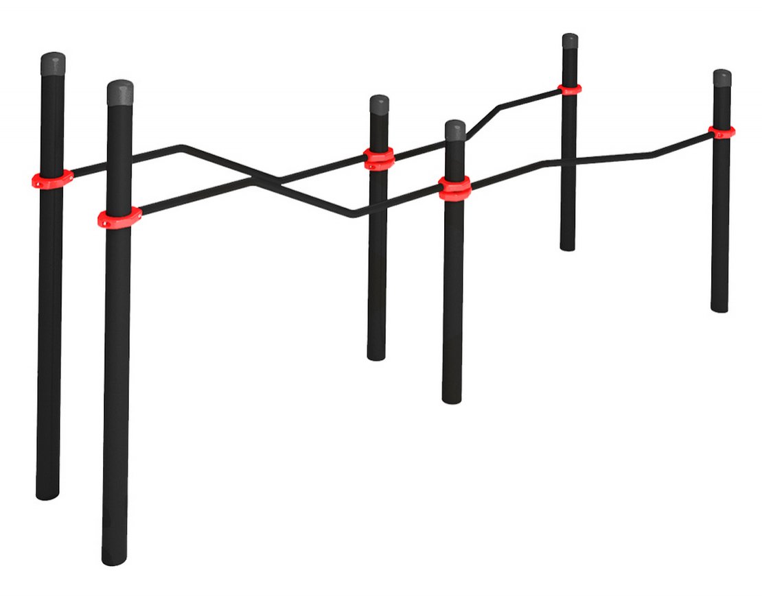 Брусья представляют собой двойные разноуровневые конструкции с удобным подъездом для колясок. Комплекс состоит из 6 опорных столбов, два из которых имеют высоту 150 см, а четыре — 120 см. Четыре зигзагообразные жерди длиной 1 790 миллиметров крепятся к столбам хомутами на высоте 1 200 миллиметров в верхней и 1 000