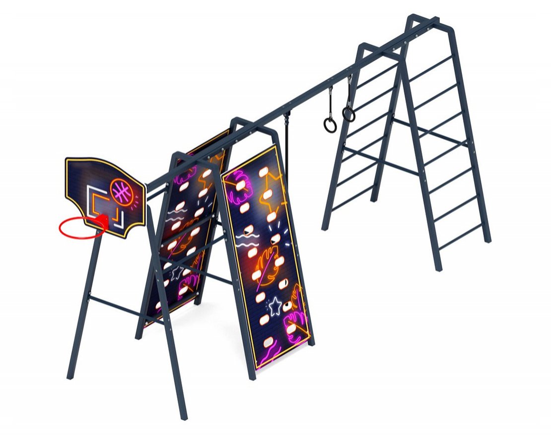 Состоит из металлической сварной подвески из трубы диаметром 32 мм (L=1700мм), металл имеет плавные радиусы и тщательную обработку швов, покрыт порошковой краской в красный цвет, канат полиамидный диаметром 26 мм, и колец гимнастических, подвешенных к полипропиленовым канатам. В комплект входит- 1 канат для лазанья, два каната для крепления колец и кольца гимнастические.