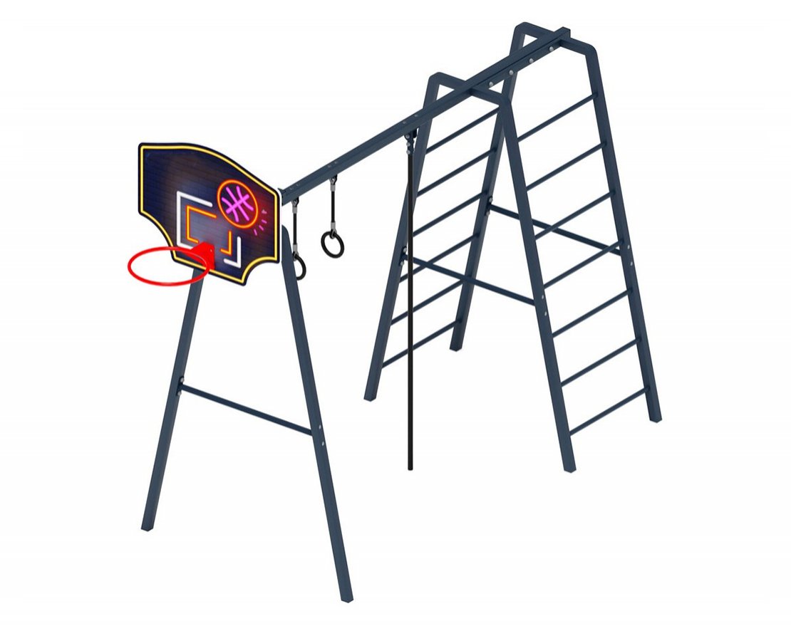 Щит из влагостойкой фанеры толщиной 18 мм, размер 1000х900. Крепится к стальной стойке из трубы диаметром 42 (1500х460х2460). На щите закреплено баскетбольное кольцо, выполненное из арматуры диаметром 16 мм, внутренний диаметр кольца-450мм.
