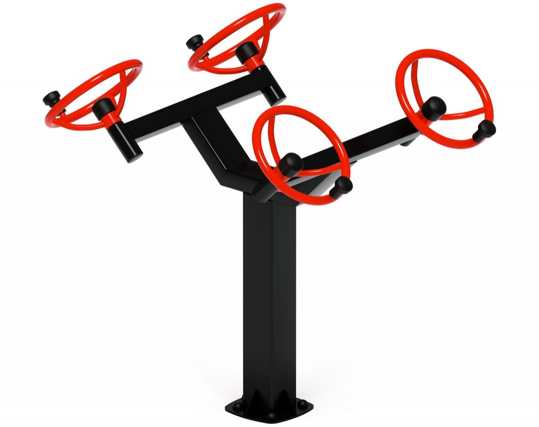 Уличный тренажёр выполнен в эффектном красном цвете с контрастными чёрными элементами. Он станет ярким акцентом на спортивной площадке и привлечёт внимание прохожих.