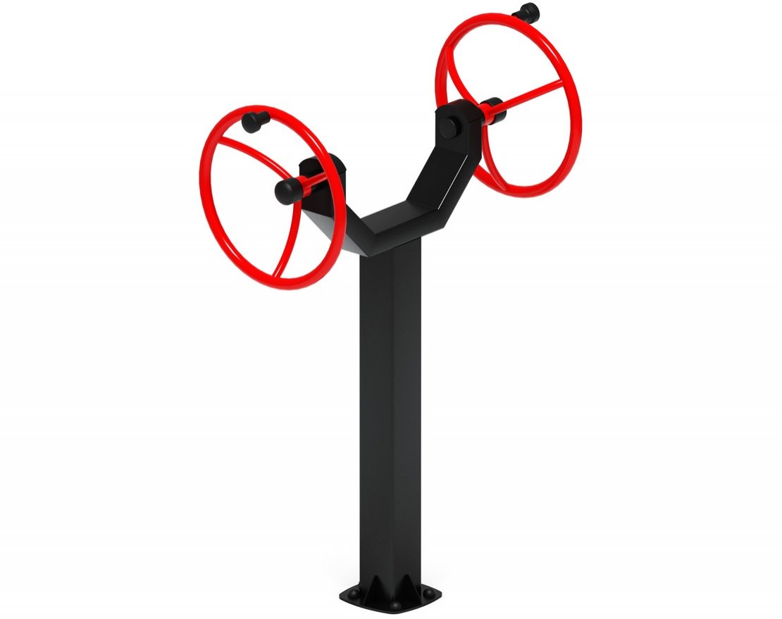 Уличный тренажёр выполнен в эффектном красном цвете с контрастными чёрными элементами. Он станет ярким акцентом на спортивной площадке и привлечёт внимание прохожих.
